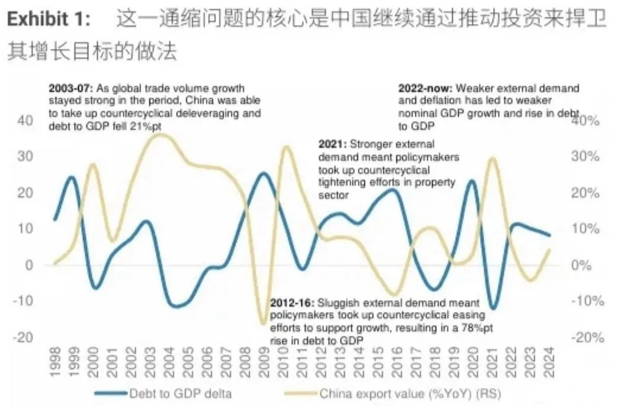 在产能方面,摩根士丹利认为中国当前的通缩并非偶然,而是长期过度投资的结果。自2021年Q2房价见顶以来,中国非房地产固定资产投资增长了26%,制造业 + 基建投资占全社会投资比例高达69%,中国在全球总投资中的占比达到惊人的26%。这种大规模的投资在短期内虽然对GDP起到了支撑作用,但也带来了严重的后遗症:产能严重过剩。以新能源行业为例,电动车电池在2025年中国的产能是全球总需求的1.3倍,太阳能组件中国供应量已经是全球需求的两倍以上。
