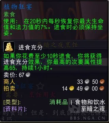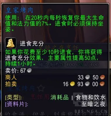 其次,这个版本有一个机制叫丰盛食物,烹饪35级解锁。效果是将5份餐合成一份丰盛餐。普通食物死亡后进食充分效果会消失,丰盛食物死亡后进食充分效果不会消失。丰盛食物是战团绑定,拍卖行不能买,所以推荐稍微练一练烹饪,这样可以去拍卖行买食物回来自己合成丰盛食物。这版本练烹饪的方法很简单,从旅店烹饪训练师旁边的材料商可以买黄油和香料粉,一直搓香料饼干就能到25级,之后随便做几个中等食物就能到35级,就能解锁丰裕了。(还想继续练的话之后一直搓丰裕食物就能直接搓到100)