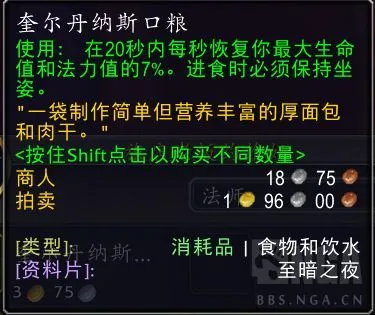 再补充一个战斗间隙用于回血回蓝的食物,可以在银月城旅店的旅店老板那里买到奎尔丹纳斯口粮,如图,效果是每秒回复7%的血和蓝。(如果大佬们发现有更好的可以提醒我一下)
