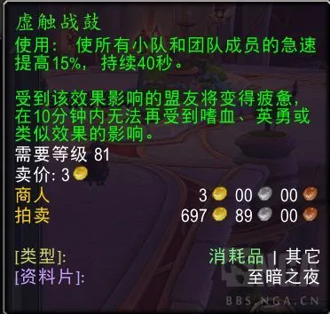 虚触战鼓,如图,要是队里实在没有嗜血职业的时候可以用这个开嗜血,但比真嗜血数值低很多。